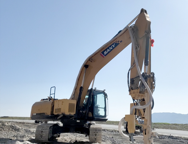 2、前后左右自由伸展,當挖掘機在工地不平坦的情況下, 挖機手可根據(jù)位置不同調整鉆桿角度,保持90°垂直鉆孔。