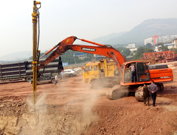 2、前后左右自由伸展,當挖掘機在工地不平坦的情況下, 挖機手可根據位置不同調整鉆桿角度,保持90°垂直鉆孔。
